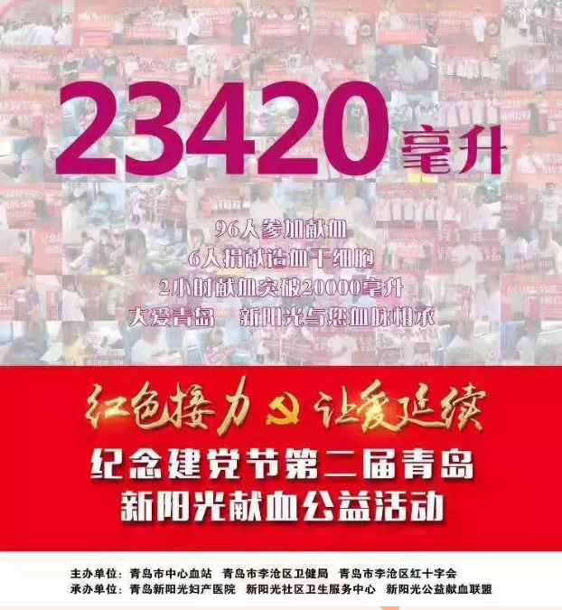 7月12日,也是三伏天第一天,在炎炎夏日下,由青岛市中心血站、青岛市李沧区卫健局、青岛市李沧区红十字会主办,青岛市李沧区李村街道协办,青岛新阳光妇产医院、新阳光书院路社区卫生服务中心、新阳光公益献血联盟承办的“红色接力•让爱延续”纪念建党节第二届青岛新阳光公益献血活动圆满成功。据统计,共有96人成功献血,总献血量达23420毫升,其中6人捐献造血干细胞,打破了第一届青岛新阳光公益献血活动日献血量10600毫升记录。